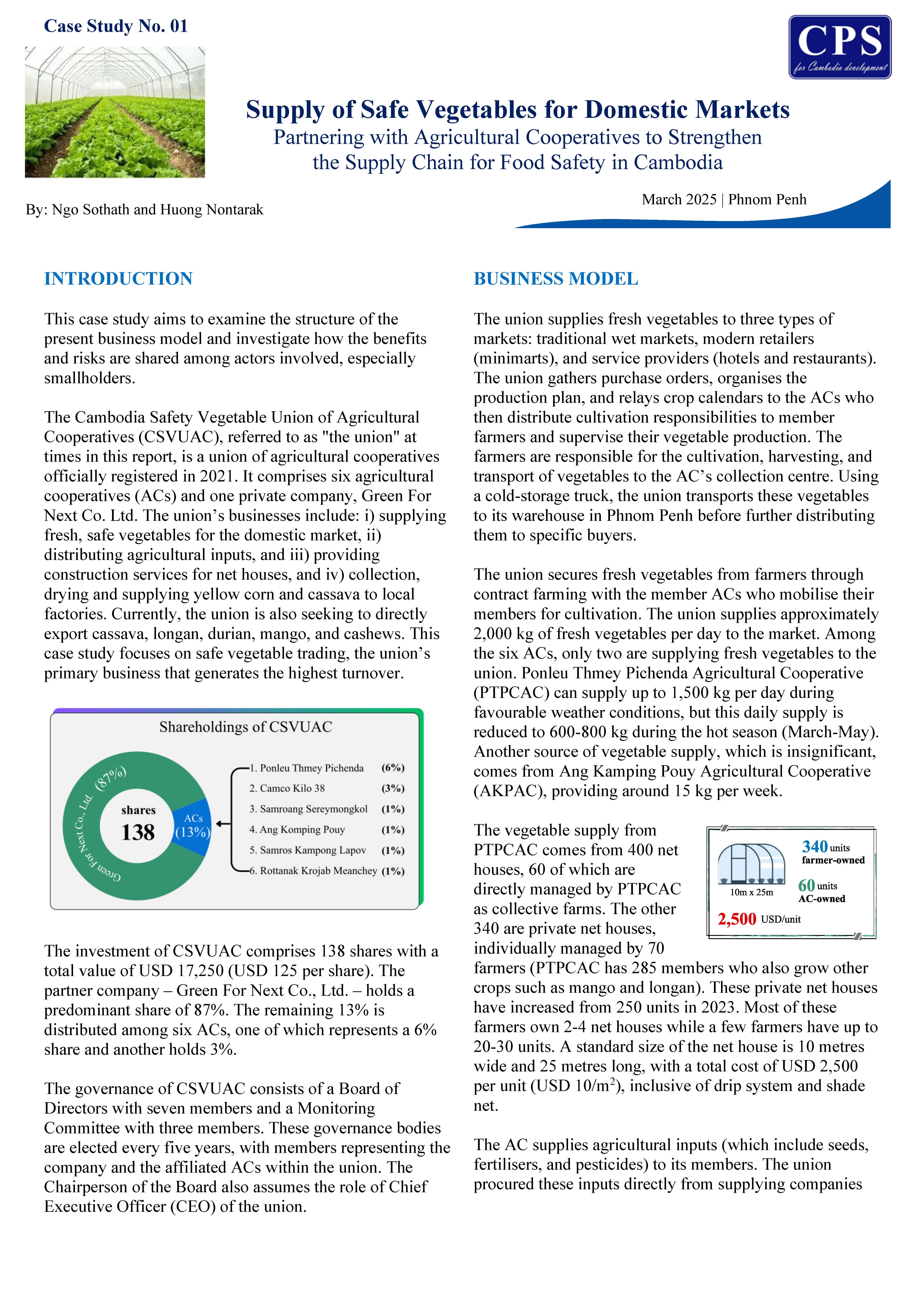This case study aims to examine the structure of the present business model and investigate how the benefits and risks are shared among actors involved, especially smallholders. The Cambodia Safety Vegetable Union of Agricultural Cooperatives (CSVUAC) is a union of agricultural cooperatives officially registered in 2021...