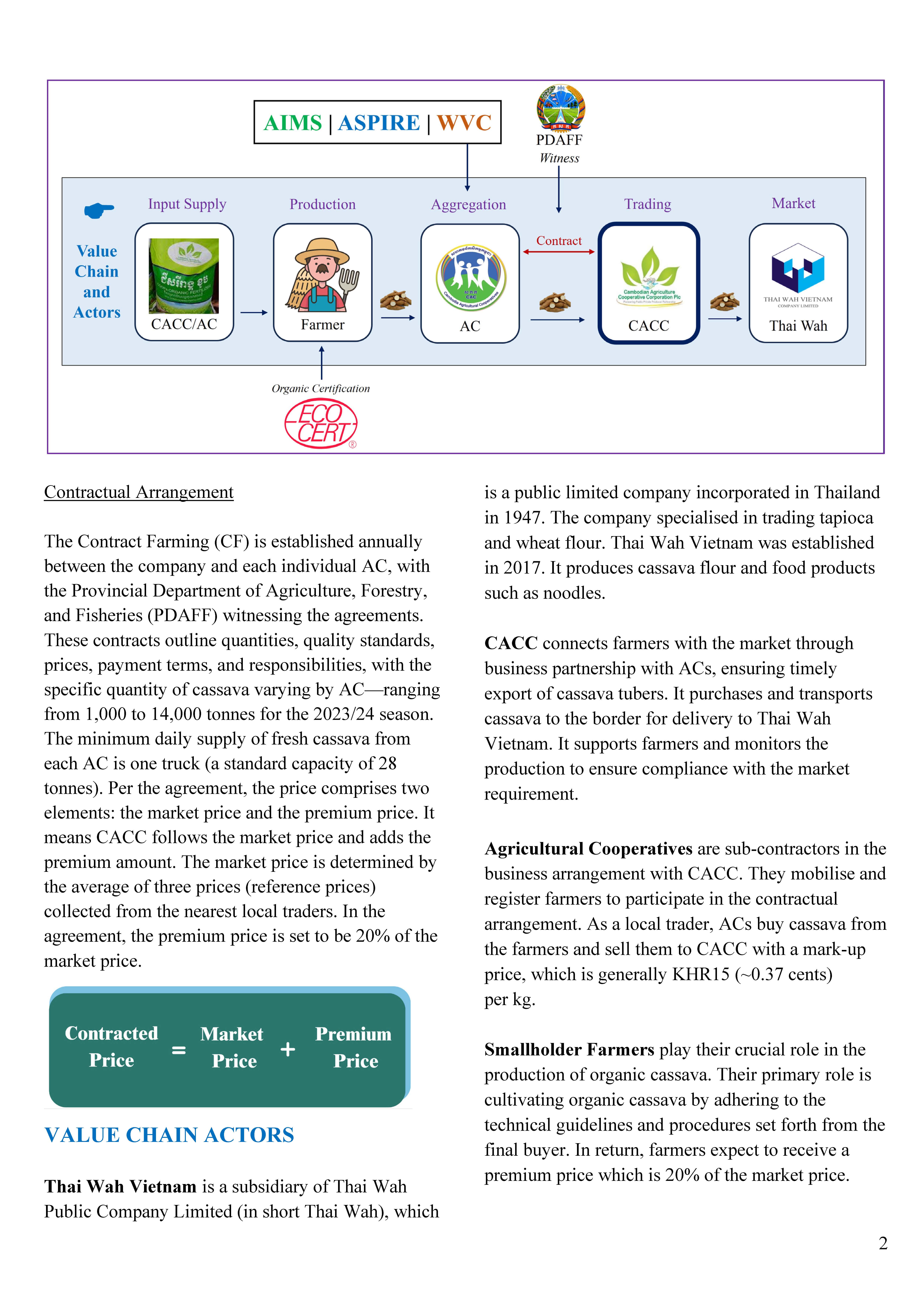 This case study focuses on the exporting of fresh organic cassava, emphasising the business model that procures fresh cassavas from smallholder farmers through contract farming with Agricultural Cooperatives (ACs), and then supplies them to a buyer in Vietnam...